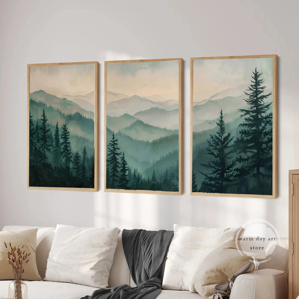 Sage Green Mountain Poster Wall Art Watercolor Mountain Pine Forest Landscape Canvas Painting Abstract Nature Print Home Decor