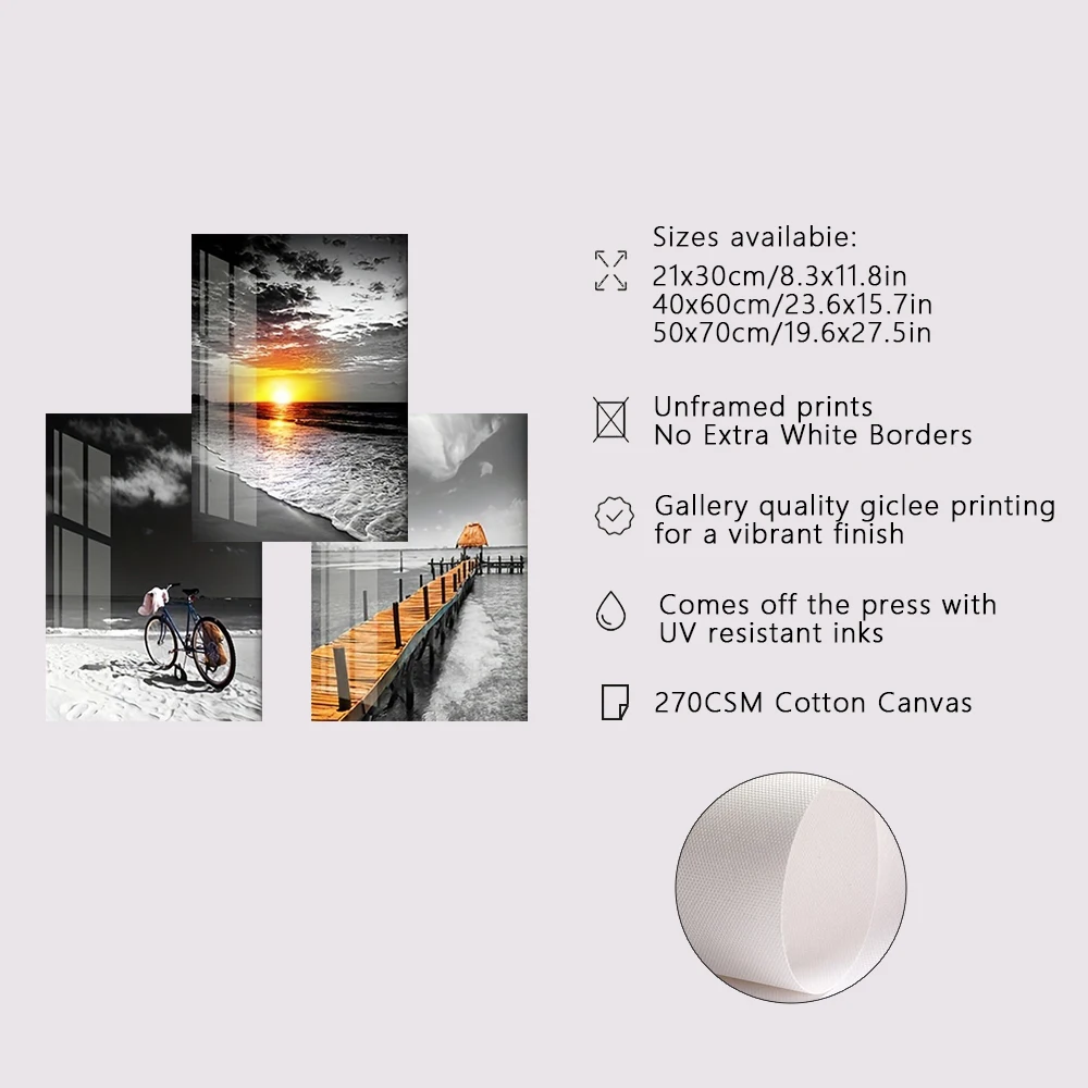 3PCS Frameless Canvas Beach Sunrise Paintings Prints Black White Landscape Pictures Modern Pictures for Bedroom Living Room Home