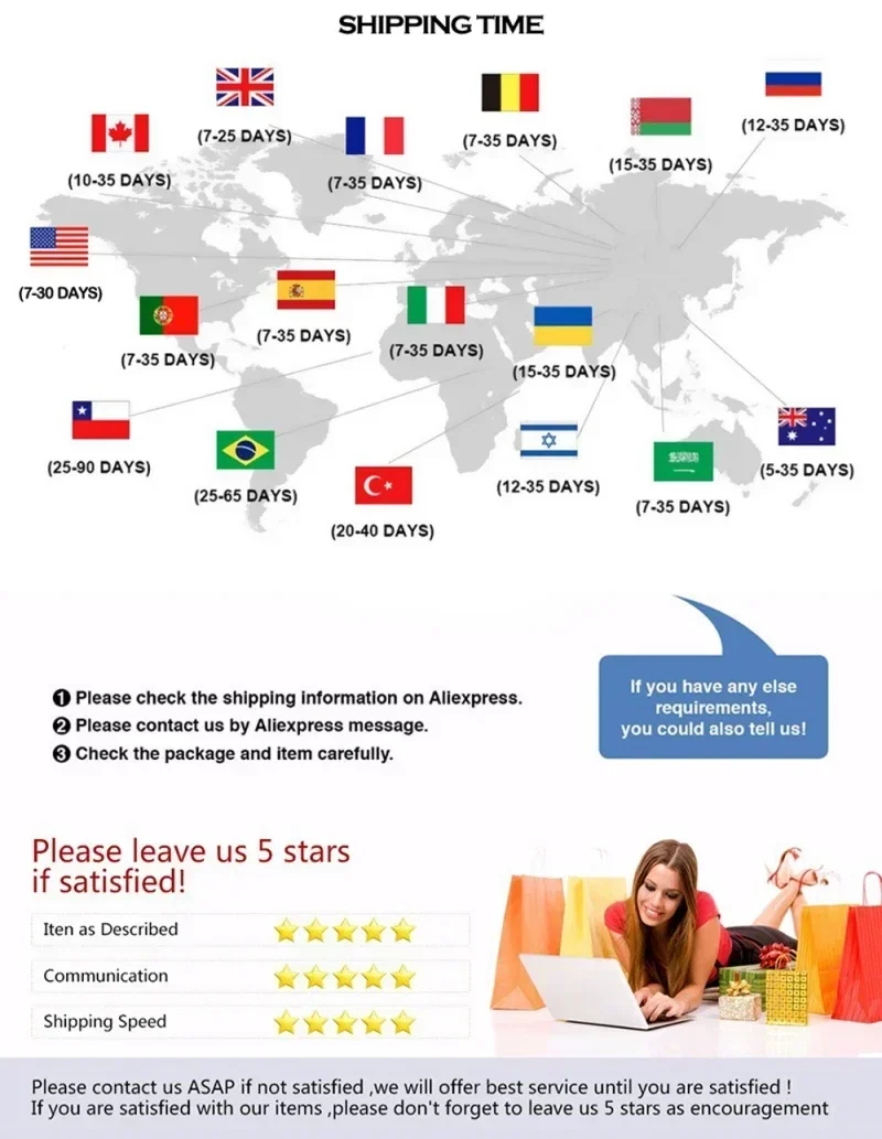 5.The expected delivery date will be affected by customs, weather etc., sometimes it may tak e a little longer to receive,Please contact us when you have not received the package to extend your order protection time.